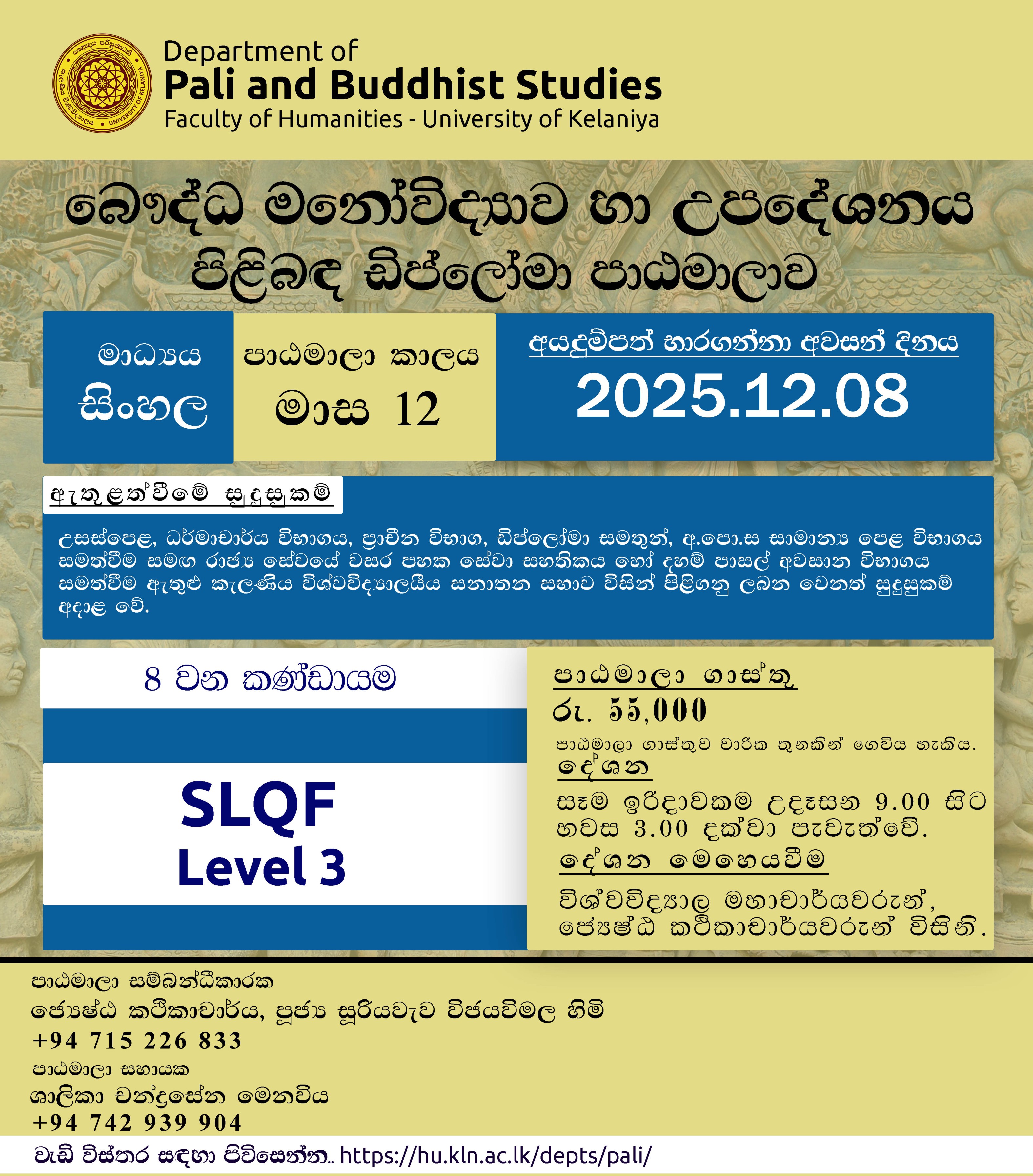 Lecture Series on English Speech and Writing, conducted by Ven. Kottawe Dhammadassi Thero. every Thursday from 2.00 PM to 5.00 PM at the K2 A Room. Upon successful completion, participants will receive a valuable certificate recognizing their dedication and achievement. For coordination and further details, please contact Miss. Nadeesha Rajapaksha at 0715 517 950. Don’t miss this opportunity to develop your communication skills in a supportive and scholarly environment.